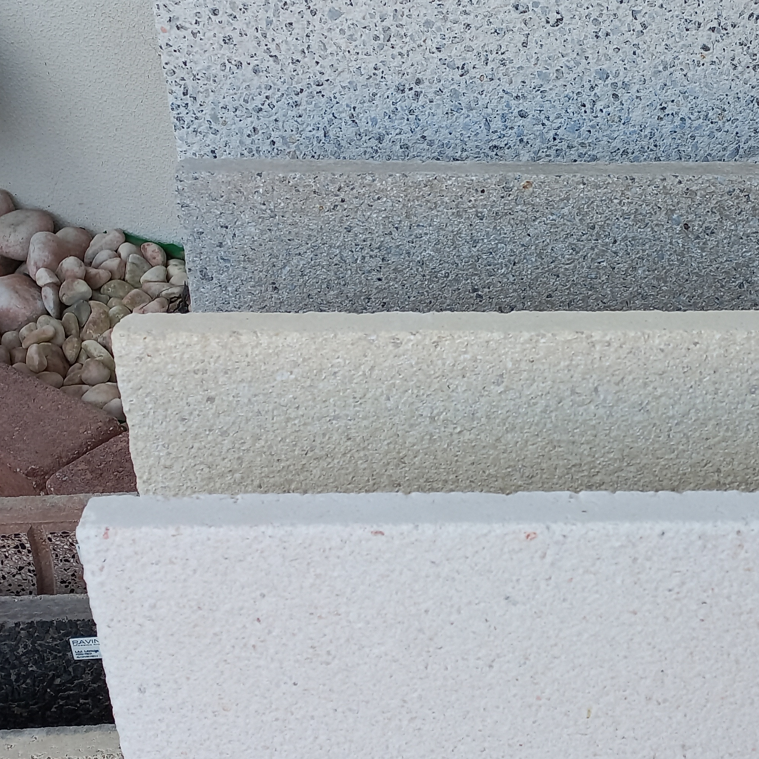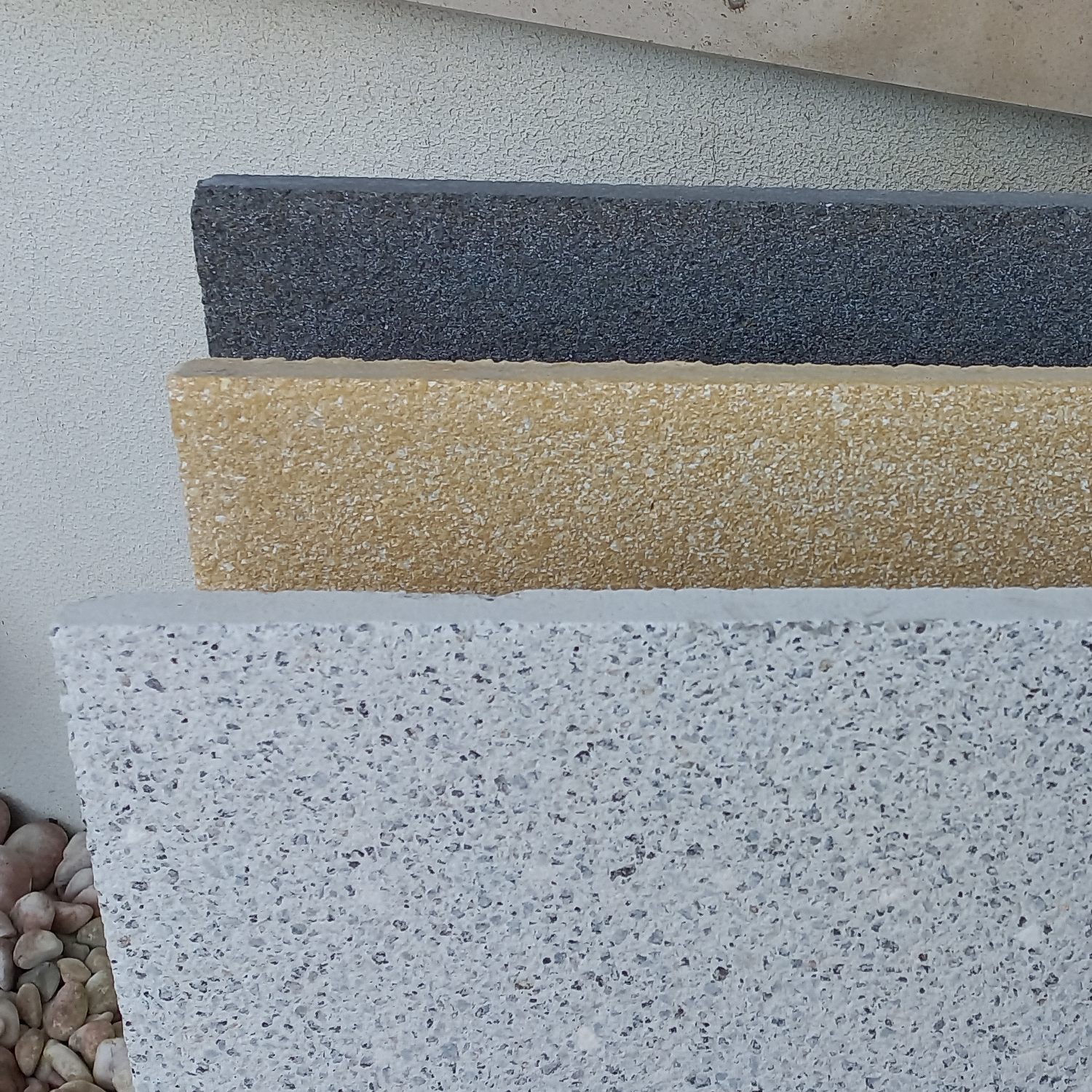 Placa em aglomerado de pedra com bujardado suave, ideal para piscinas e terraços.